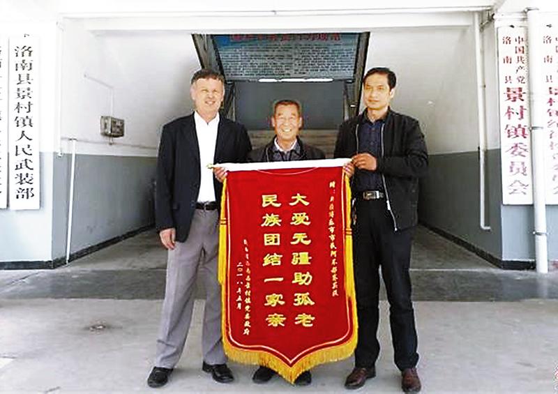 為了感謝阿不都賽買提·依侖巴依對景村人民的熱心幫助,景村鎮(zhèn)黨委、政府和楊坪村村委會分別制作了一面錦旗,贈送給了阿不都賽買提·依侖巴依。錦旗上寫道:“大愛無疆助孤老,民族團結(jié)一家親。”這短短的14個字,高度濃縮并概括了阿不都賽買提·依侖巴依助人為樂的善行義舉和人格魅力。
