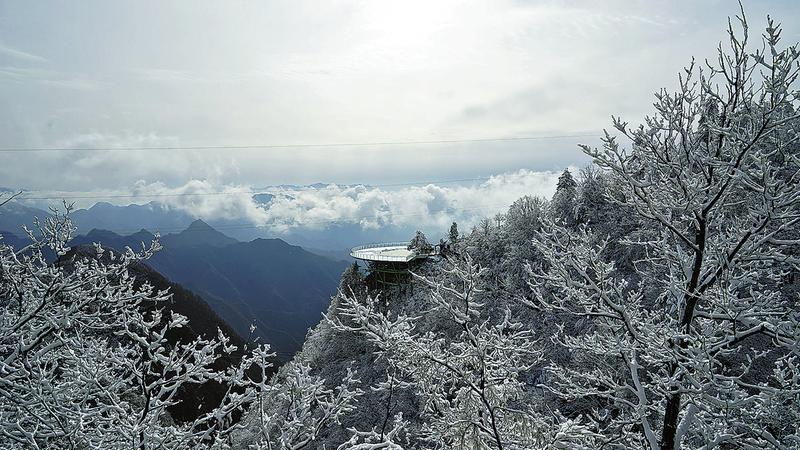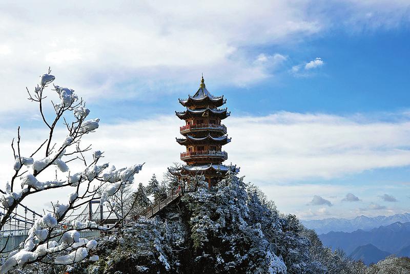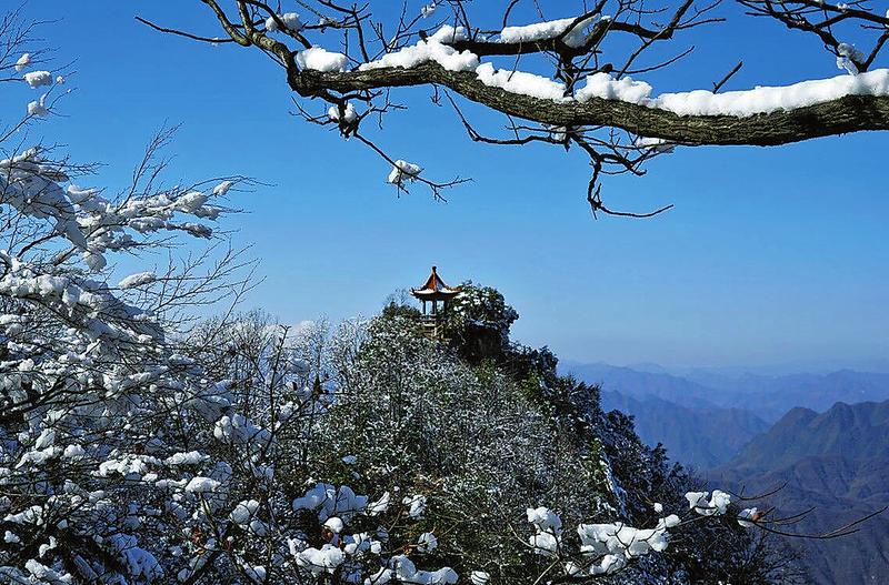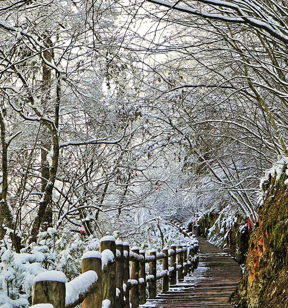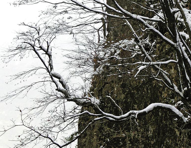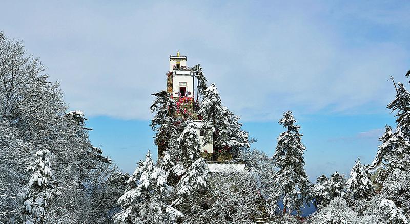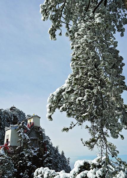 塔云山海拔1600多米,氣溫低,每當山下冬雨紛紛時,這里已是雪花飄飄,銀裝素裹。山上植被高達95%以上,到處是蒼松翠柏,使這里形成了千奇百怪的霧凇景觀。那落葉的樹枝突然變得肥胖,一棵樹就是一盆珊瑚奇景;那些沒有落葉的喬木、灌木,在冬雪的裝扮下開出棉花般的大團花朵;那歷經(jīng)五百多年的道觀,被白雪悄然覆蓋,變得更加圣潔靜謐。在這潔白的世界里,塔云山的每一處景觀、每一個建筑,都是一幅水墨畫,讓人過目難忘。
