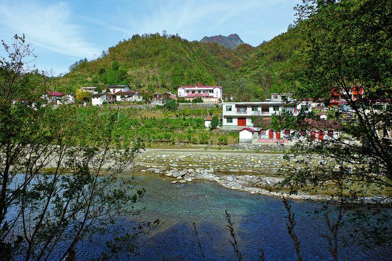 過了小川口就是朝陽,這里曾駐扎過朝陽鄉(xiāng)政府,因山上有座結(jié)草為庵的朝陽觀而得名。老房子除了幾間灶房外,私有化以后都拆舊建新了。過了朝陽,只見河邊一排大小整齊的楊樹,在夕陽的映照下葉子泛著金黃。