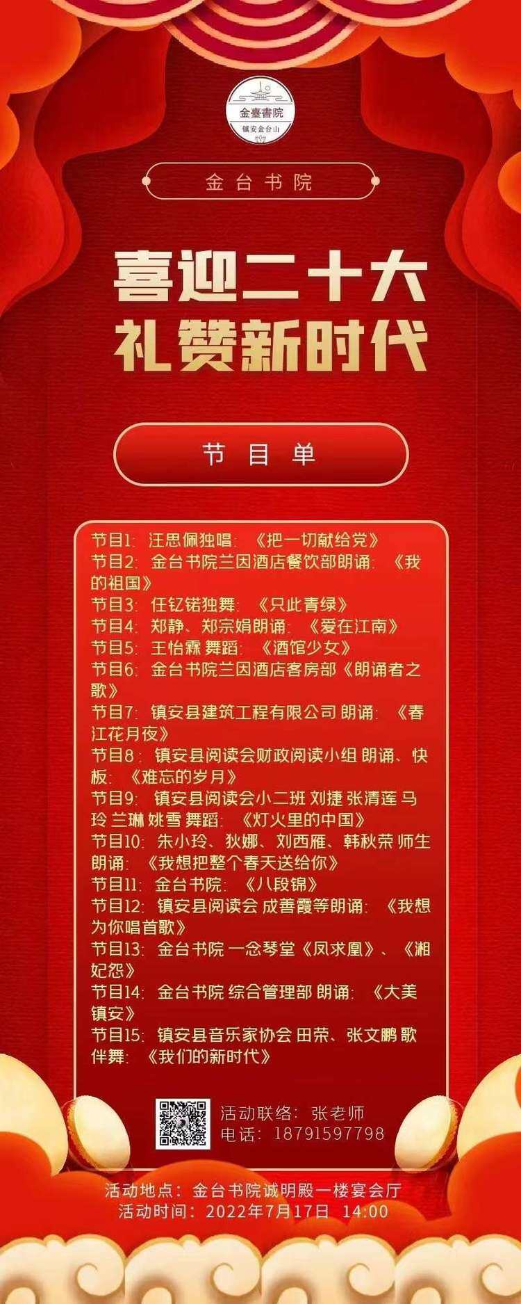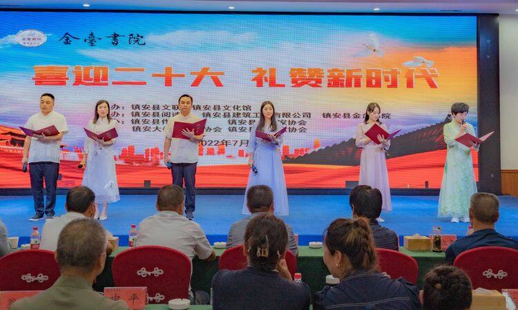 7月17日,由鎮(zhèn)安縣文聯(lián)、鎮(zhèn)安縣文化館主辦,鎮(zhèn)安縣閱讀會、鎮(zhèn)安縣建筑工程有限公司、鎮(zhèn)安縣金臺書院承辦,鎮(zhèn)安縣作家協(xié)會、鎮(zhèn)安縣書法家協(xié)會、鎮(zhèn)安大秦嶺攝影協(xié)會、鎮(zhèn)安縣音樂家協(xié)會協(xié)辦的“喜迎二十大 禮贊新時代”及鎮(zhèn)安縣閱讀會金臺書院分會成立大會線下朗誦文藝交流活動,在鎮(zhèn)安縣金臺書院蘭因酒店誠明殿一樓宴會廳成功舉行。 活動伊始,鎮(zhèn)安縣金臺書院院長翁芳發(fā)表了熱情洋溢的講話,指出金臺書院始終堅守“德業(yè)并重,以德為本”的核心價值觀,以文化為引領,下設文化酒店、文化平臺、文化教育、文化產(chǎn)品四個中心。金臺書院悅讀會是打造書香書院的重要載體,是實現(xiàn)書院文化平臺功能的重要舉措。鎮(zhèn)安閱讀會金臺書院分會今天正式成立,金臺書院閱讀基地正式授牌,書院將以此為新的起點,充分發(fā)揮鎮(zhèn)安閱讀會和金臺書院的“資源、環(huán)境、人文”優(yōu)勢,充分發(fā)揮金臺書院作為鎮(zhèn)安一張閃亮的文化名片和文化平臺的功能,不忘初心,砥礪奮進,努力打造鎮(zhèn)安人的精神家園,為全民閱讀建設書香鎮(zhèn)安作出應有的貢獻! 鎮(zhèn)安縣閱讀會會長雷曼曼宣讀鄭靜為鎮(zhèn)安縣閱讀會金臺書院分會會長,翁國淇、郭曉春為副會長,張建為秘書長的任命文件;鎮(zhèn)安縣文聯(lián)主席楊逍為鎮(zhèn)安縣閱讀會金臺書院分會、鎮(zhèn)安縣閱讀會金臺書院閱讀基地授牌;鎮(zhèn)安縣閱讀會秘書長朱麗頒發(fā)聘書。鄭靜老師回顧了金臺書院悅讀會成立一年來取得的成績,表示未來將一如既往,帶領大家堅持每日誦讀,始終和大家一起,全力以赴,同舟共濟,盡最大努力,共同把金臺書院悅讀會推向新征程! 演出在高亢嘹亮的《把一切獻給黨》獨唱中拉開序幕,金臺書院蘭因酒店餐飲部詩朗誦《我的祖國》道出中華兒女對祖國的深厚情感,舞蹈《只此青綠》傳遞了對中華民族優(yōu)秀傳統(tǒng)文化的傳承和創(chuàng)新表現(xiàn)。隨著舞蹈、古琴演奏、配樂詩朗誦、八段錦展示等一個個精彩節(jié)目的上演,臺下觀眾不時傳來陣陣熱烈掌聲和喝彩聲,合唱《我們的新時代》更是把整場演出推向了高潮。 此次演出的16個文藝節(jié)目精彩紛呈,表達了鎮(zhèn)安兒女愛國愛黨愛家情懷,展示了鎮(zhèn)安縣閱讀會各個分會成員、鎮(zhèn)安縣建筑工程公司及金臺書院全體員工昂揚向上的精神風采,為迎接黨的二十大勝利召開營造了濃郁的文化氛圍。