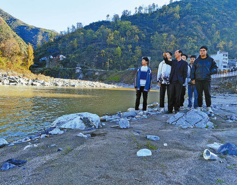 11月15日,盧進(jìn)明在干佑河邊向青銅關(guān)中學(xué)學(xué)生講述自己救人的故事。