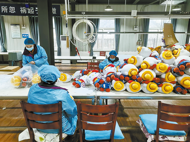 工人們身著防護(hù)服,在車間趕制毛絨玩具。