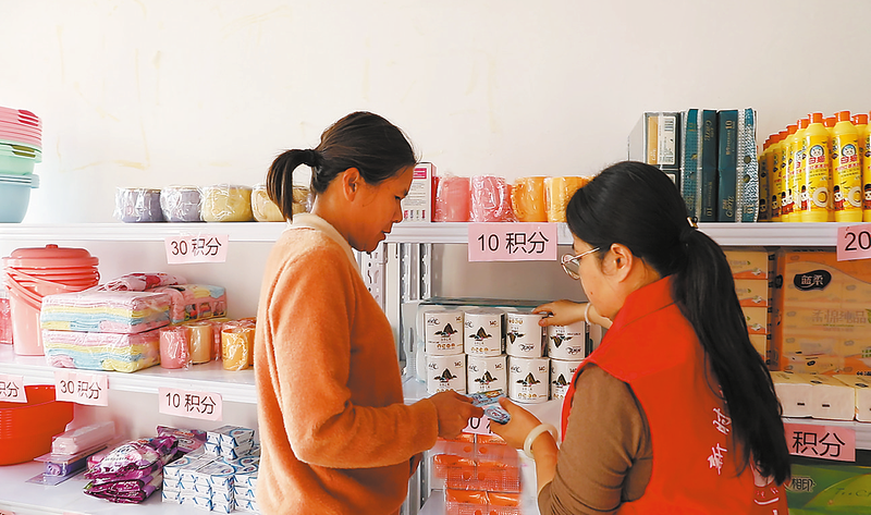 △3月2日,廟溝鎮(zhèn)雙喜村群眾在“道德超市”用積分兌換生活用品。