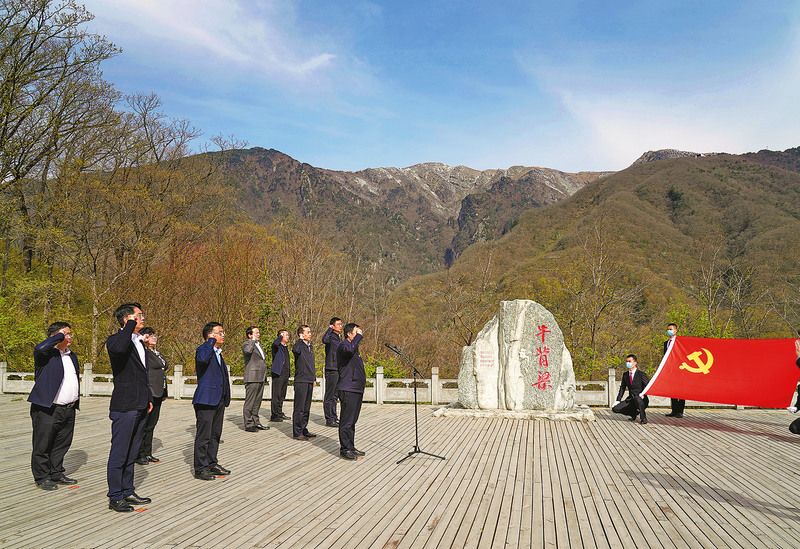 柞水縣委理論學(xué)習(xí)中心組成員在牛背梁進(jìn)行現(xiàn)場(chǎng)實(shí)景教學(xué)